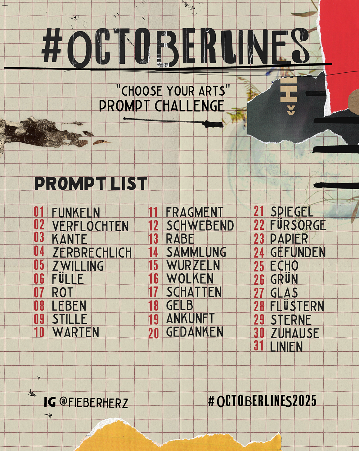 - Teile deine Werke dort, wo du magst, und nutze die Hashtags #octoberlines und #octoberlines2025, um dich mit anderen zu verbinden.